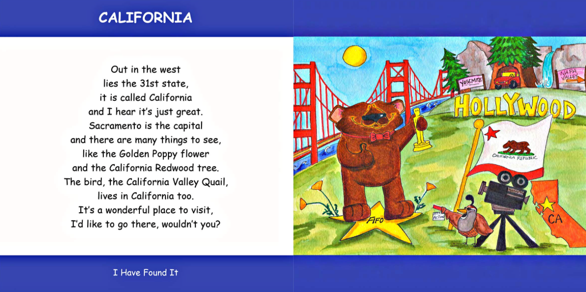 Fifo 50 States is a colorful reference-like geography book, where Fifo discovers the wonders each state has to offer. He learns along the way each state's capital, shape, flag, motto, and much, much more. In this delightful rhyming story, Fifo, a warm and lovable brown bear, is bitten by the travel bug. Fifo dreams of digging up diamonds in Arkansas, looking for fossils in Kansas, enjoying a delicious bowl of gumbo in Louisiana, and even seeing a Broadway show in New York. Yes, America is an exciting place! The possibilities are endless, so come along with Fifo and you'll soon discover the beauty of America one state to another.  Fifo 50 States is told in a fun, sing-song rhyme with educational facts about each state.